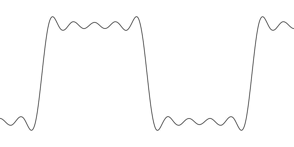 Keywords: Gibbs phenomenon 10.svg Valid SVG Picture of a function <math>\sin x +\frac 1 3 \sin 3x +\frac 1 5 \sin 5x +\frac 17\sin 7x +\frac 19\sin 9x </math> as the 5-th approximation the first five terms of the wave function <math> f\left x\right \sum_ n 1 \infty \ \frac 1 2n-1 \sin 2n-1 x </math> which is the Fourier series of the function <math>f x \begin cases 0 x 2n\pi\\ \pi/4 2n\pi < x < 2n+1 \pi\\ 0 x 2n+1 \pi\\ -\pi/4 2n+1 \pi < x < 2 n+1 \pi\\\end cases </math> own drawn with Inkscape's function plotter 2010-05-01 Johannes Rössel <span class signature-talk >talk</span> <gallery>File Gibbs phenomenon 10 png PNG version</gallery> Gibbs phenomenon Fourier transformation Fourier series Order 5 |