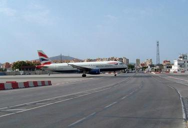Keywords: Gibraltar Airport plane taking off.jpg Airplane taking off across road in Gibraltar own 2006-06-08 Scott Ehardt SCEhardt Airbus A320 British Airways British Airways Winston Churchill Avenue Gibraltar Aircraft at Gibraltar Airport