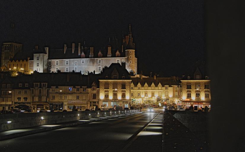 Keywords: gien night evening light lighting illuminations light reflections city docks bridge river architecture castle château de gien heritage buildings