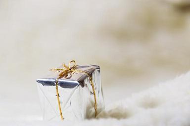 Keywords: gift box silver gold ribbon snow white winter christmas new year's eve postcard background holiday surprise