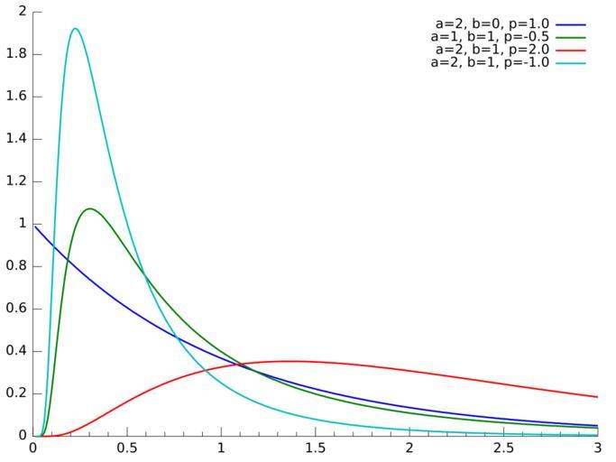 Keywords: GIG distribution pdf.svg generalized inverse Gaussian distribution 2013-03-10 10 41 55 own Krishnavedala Octave source code <syntaxhighlight lang Matlab > x 0 01 0 01 3; f x a b p a/b 0 5 p x p-1 exp - 5 a x+ b /x / 2 besselk p sqrt a b ; a 2 1 2 2; b 1e-10 1 1 1; p 1 - 5 2 -1; for i 1 length a y i f x a i b i p i ; l i sprintf 'a d b d p 1f' a i b i p i ; end plot x y ; box off; set gca 'ytick' 0 2 2 legend l ; </syntaxhighlight> cob validSVG created with Gnuplot cc-zero Probability distributions |