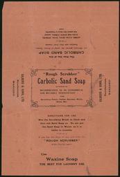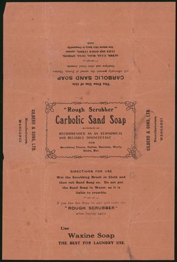 | Keywords: text document writing Soap wrapper describing the uses of the soap ("Germs, fleas, bugs, ticks, spiders, flies and other vermin cannot live where this soap is frequently used"). Gives directions for use: "Wet the scrubbing brush or cloth and then rub sand soap on. Do not put the sand soap in water, as it is liable to crumble. Also advocates Waxine soap for laundry use. Quantity: 1 b&w art print(s). Physical Description: Letterpress, on red paper 282 x 189 mm. Provenance: Purchased from Barney Brewster, Nelson, in 2006. J B Gilberd & Sons Ltd. Gilberd & Sons Ltd :"Rough scrubber" carbolic sand soap, recommended as an economical and reliable disinfectant for scrubbing floors, tables, benches, walls, sinks, etc. The free use of this carbolic sand soap will effectually prevent the spread of fevers, cholera, smallpox and other dread diseases ... [Wrapping. ca 1910-1920s?]. [Ephemera related to cleaning, cleansers, cleaning agents and chemicals, laundry and laundries, dry cleaners. 1900-1949]. Ref: Eph-B-CLEANING-1910s-01. Alexander Turnbull Library, Wellington, New Zealand. natlib.govt.nz/records/22401207 Soap wrapper describing the uses of the soap ("Germs, fleas, bugs, ticks, spiders, flies and other vermin cannot live where this soap is frequently used"). Gives directions for use: "Wet the scrubbing brush or cloth and then rub sand soap on. Do not put the sand soap in water, as it is liable to crumble. Also advocates Waxine soap for laundry use. Quantity: 1 b&w art print(s). Physical Description: Letterpress, on red paper 282 x 189 mm. Provenance: Purchased from Barney Brewster, Nelson, in 2006. J B Gilberd & Sons Ltd. Gilberd & Sons Ltd :"Rough scrubber" carbolic sand soap, recommended as an economical and reliable disinfectant for scrubbing floors, tables, benches, walls, sinks, etc. The free use of this carbolic sand soap will effectually prevent the spread of fevers, cholera, smallpox and other dread diseases ... [Wrapping. ca 1910-1920s?]. [Ephemera related to cleaning, cleansers, cleaning agents and chemicals, laundry and laundries, dry cleaners. 1900-1949]. Ref: Eph-B-CLEANING-1910s-01. Alexander Turnbull Library, Wellington, New Zealand. natlib.govt.nz/records/22401207 |