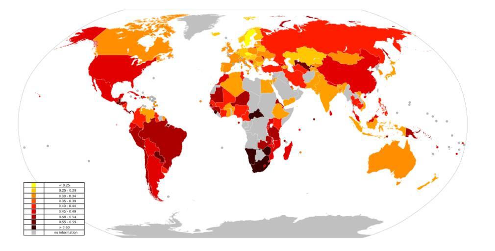 Keywords: Gini Coefficient World CIA Report.svg en Based on statistics published by the CIA Not all countries are up-to-date https //www cia gov/library/publications/the-world-factbook/fields/2172 html 2014-07-12 18 05 49 own Kurzon cc-zero Uploaded with UploadWizard Gini coefficient maps of the world |