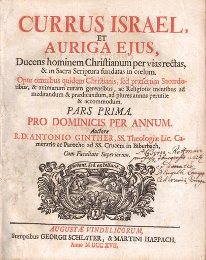 Keywords: Ginther Currus Titel.jpg Titelblatt aus u g Werk 'CURRUS ISRAEL ET AURIGA EJUS Ducens hominem Christianum per vias rectas in Sacra Scriptura fundatas in coelum' von Anton Ginther Augsburg Schlüter und Happach 1717 Ed 1 1717 Anton Ginther frei PD-old-100 Books from Germany Biberbach Swabia Anton Ginther 1717 books |