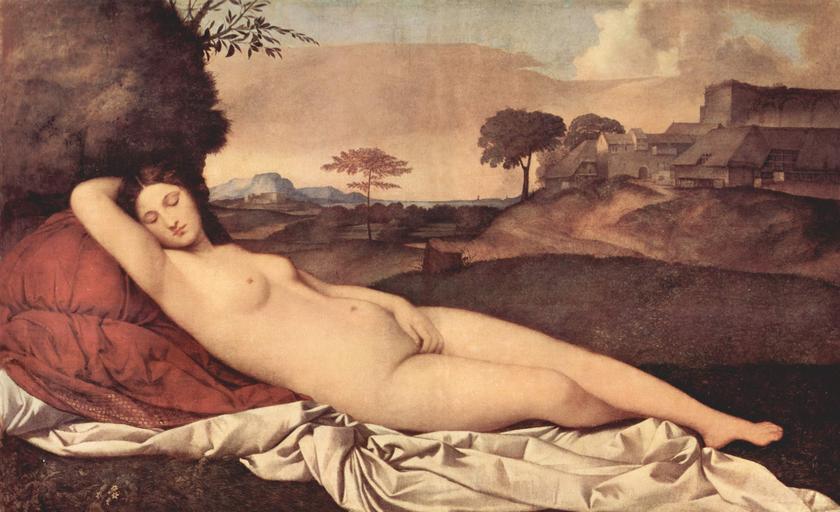 | Keywords: Giorgione 054.jpg Artwork Creator Giorgione Venere dormiente Sleeping Venus de Schlummernde Venus ca 1508 1510 oil on canvas cm 108 175 Institution Gemäldegalerie Alte Meister de Auf dem Gemälde befand sich urspr ein von Tizian gemalter Cupido der im 19 Jh übermalt wurde en This painting was done by Giorgione in approx 1509 c It was unfinished at the time of his death and the sky was later finished by Titian Titian also painted a similar Venus but it was not as agitated and unsettled as Giorgione's nude Obviously a painting with underlying erotic implications this can be seen by the Venus' raised arm the exposed arm pit a symbol of sexuality and also the blatant placement of her left hand The sheets are a silver colour a cold colour rather than a more commonly used warm tone and they are very rigid looking in comparison to Titian's or Velzquez's Venus' The landscape mimicks the curves of the nude and this in turn relates the human body back to natural organic object The Yorck Project 10 000 Meisterwerke der Malerei DVD-ROM 2002 ISBN 3936122202 Distributed by DIRECTMEDIA Publishing GmbH http //mail wikipedia org/pipermail/wikide-l/2005-April/012195 html Commons Licensing PD-old-100 PD-Art-YorckProject Sleeping Venus by Giorgione Subjective Database of Paintings |