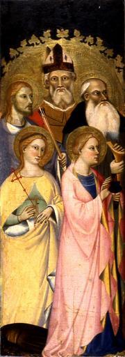 | Keywords: Giovanni del Biondo - Five Saints - Walters 37719.jpg Four of these saints are recognizable by their attributes Sebastian by his arrows Anthony Abbot by his staff Margaret by her dragon and Lucy by her burning lamp The fifth is a bishop as indicated by his miter; his crozier is incised directly into the gold leaf above Anthony Abbot's head While three of the saints face toward what would have been the altarpiece's main panel two turn their gaze outward By directing the gaze of selected figures towards the worshiper the painter made the saints appear more attentive to the needs of those who looked to them for help and protection For more information on this panel please see Zeri catalogue number 10 pp 17-18 between 1370 1379 Medieval tempera and gold leaf on panel Painted surface cm 123 2 44 1 2 accession number 37 719 26136 Marquess Filippo Marignoli Rome and Spoleto until 1898 mode of acquisition unknown Marquess Francesco Marignoli 1898 mode of acqusition unknown Don Marcello Massarenti Collection Rome 1899 1900 catalogue supplement no 26 attributed to Simon Memmi Henry Walters city Baltimore Walters Art Museum 1931 by bequest Acquired by Henry Walters with the Massarenti Collection 1902 place of origin Florence Italy Walters Art Museum license 2D Medieval art in the Walters Art Museum Giovanni del Biondo Croziers in art Paintings in the Walters Art Museum |