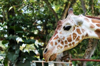 Keywords: giraffe animals mammals head face portrait tall herbivorous brown spots forests zoo trees greenery leaves leafy green background jungle