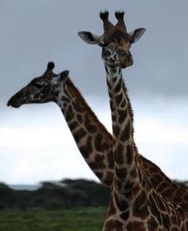 Keywords: giraffe pair animals mammals two animals togetherness portrait brown spots long necks tallest wildlife cloudy sky background