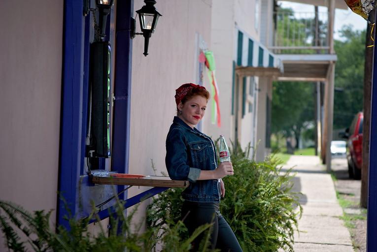 Keywords: girl 50's style retro style vintage fashion 50's female young attractive fifties happy pinup stylish hairstyle posing redhead coke coca-cola bottle drink soda