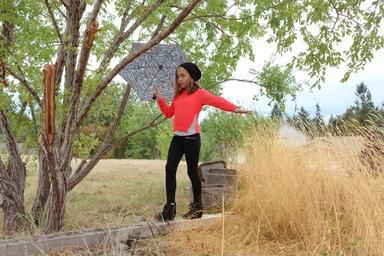 Keywords: girl balance balancing young child walking woods umbrella sweater trees grass hat log people teenage