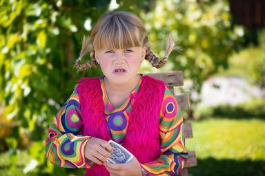 Keywords: girl blond braids face portrait summer out playing cards colorful mimic expression grim evil angry upset green garden in the garden play close person human