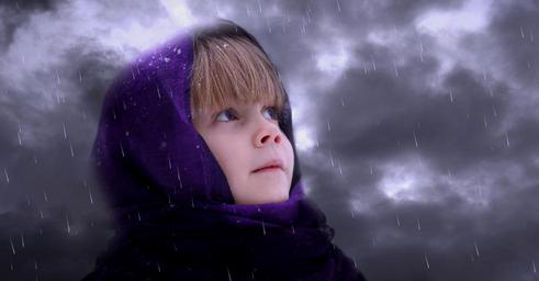 Keywords: girl cap scarf blond storm rain dark child face winter cold