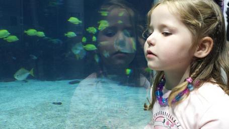 Keywords: girl child fish reflection aquariam kid childhood fun children tropical fish