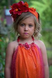 Keywords: girl face sad expression young female portrait fashion skin cute youth head makeup colorful headband flowers child dress orange red
