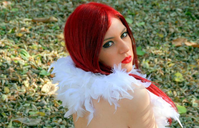 Keywords: girl feather snowflakes white red hair beauty seductive autumn forest