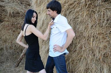 Keywords: girl female woman man male black dress haystack black hair white shirt posing