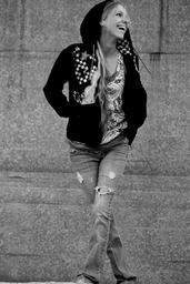 Keywords: girl happy laughing female young woman beautiful pretty smile happiness portrait attractive expression cold jacket black and white