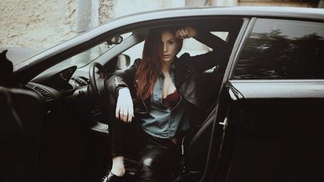 Keywords: girl in the car photoshoot behind the wheel model woman girl in car dress beauty view redhead women sitting dark background people person hands posture youth female erotic breast erotica shoes views female hands hair hairstyle fashion