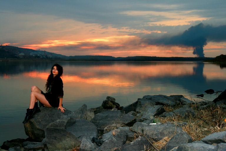 Keywords: girl lake sunset reflection in the evening beauty seductive