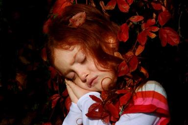 Keywords: girl leaves autumn red asleep portrait red hair redhead beauty child