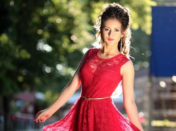 Keywords: girl long hair dress red brown eyes light beauty portrait