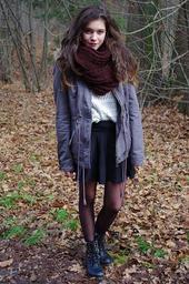 Keywords: girl model fashion skirt pose scarf nylons view forest