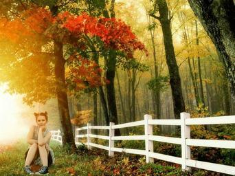 Keywords: girl sitting outdoors nature fence picket young sunny day wood green grass cute country wooden landscape woman portrait person relax resting summer white trees