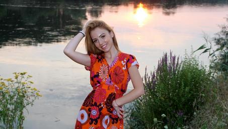 Keywords: girl sunset lake water reflection blonde beauty in the evening