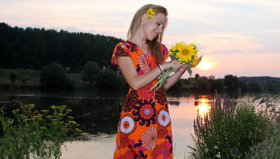 Keywords: girl sunset sunflower lake water reflection blonde beauty in the evening