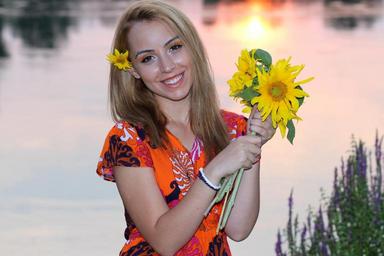 Keywords: girl sunset sunflower lake water reflection blonde beauty in the evening