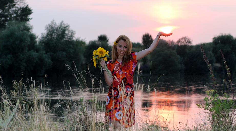 Keywords: girl sunset sunflower lake water reflection blonde beauty in the evening