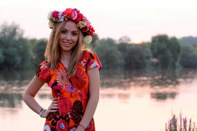 Keywords: girl sunset wreath lake water reflection blonde beauty in the evening