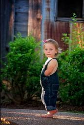 Keywords: girl walking toddler looking summer nature outdoor park outside active portrait child overalls barefoot shrubs tin building