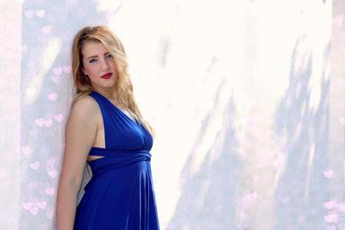 Keywords: girl wall leaning blonde blue eyes dress blue