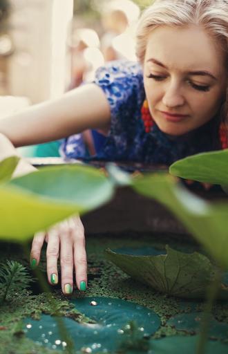 Keywords: girl water lily rosa fountain model summer water outdoors beauty greens dress hair youth blonde sunny day portrait