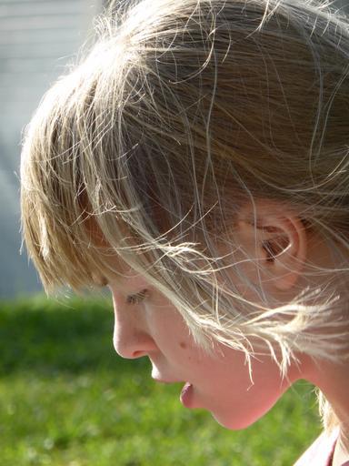 Keywords: girl wind blond hair side profile ear mouth lips nose