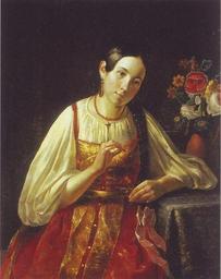 | Keywords: Girl with flower by S.A. Antonov (1842, Russian museum).jpg С А Антонов Девушка ощипывающая цветок 1842 Холст масло 89 х 72 Сп ава внизу С Антонов I 18-42 Пост в 1931 из магазина 68 Ленто гсина Ж-3742 За эту ка тину называвшуюся «Русская девушка ощипывающая цве- ток» в 1842 Антонов получил звание свободного художника Изоб- ажая сцену из жизни п остого люда художник п оисходивший из санкт-пете бу гских мещан вольноп иходящий «посто онний» как писали в документах того в емени ученик Академии художеств боль- шое внимание уделил не столько психологической ха акте истике об аза сколько деталям аметив на заднем плане печь словно бы сложенную из г анитных блоков живописец тщательно выписал де- вушку с косой в на ядном са афане занимающуюся гаданием на лепестках цветка Изысканный букет стоящий на столе к естьянского дома кажется сошедшим с ка тин голландских художников кото ые Антонов мог видеть в Э митаже и тщательно восп оизвести демон- ст и уя свое масте ство Лица России По т етная гале ея Русского музея 1842 Antonov Faces of Russia GRM 2012 19th-century paintings in the Russian Museum Paintings of Russian women in national dress Files uploaded by Shakko from various sources 1842 paintings PD-old |