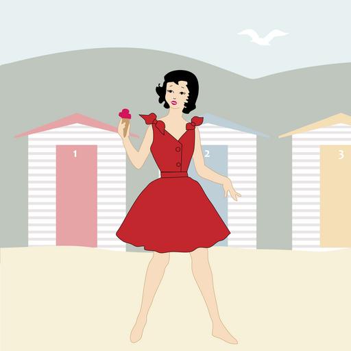 Keywords: girl woman beach seaside 1950s ice cream young young woman happy lifestyle holiday sand beach house art red dress vacation outdoors cute person summer female