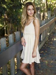 Keywords: girl woman beautiful long hair brown blonde wavy posing skinny fit blue dress white looking away fence