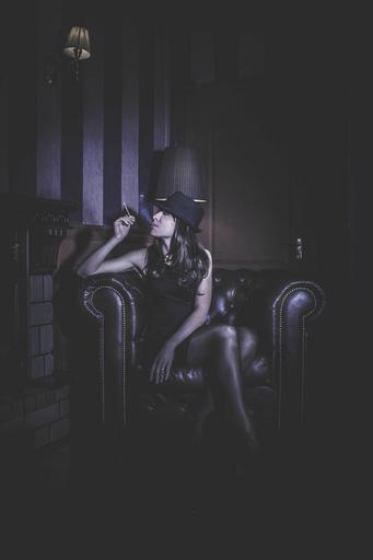 Keywords: girl woman cosmetics hair dark background model female dress posture hairstyle beauty long hair hands smokes armchair leather