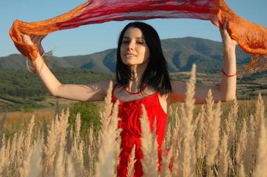 Keywords: girl woman female nature red dress field young lady scarf black hair