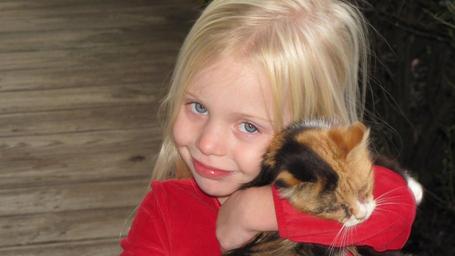 Keywords: girl young child smiling blond hugging kitten portrait expression happy sweet loving snuggle