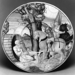 | Keywords: Giulio da Urbino - Plate with Alexander and Diogenes - Walters 481493.jpg Walters Art Museum artwork Creator Giulio da Urbino This plate with a depressed center depicts Alexander and Diogenes It is painted in blue turquoise-blue green yellow ochre tan brown black and opaque white At the left Diogenes sits in front of a tub reading At the right Alexander on horseback with three companions stops between Diogenes and the sun In the center is a large tree There is a landscape in the background The back is white stained with green and has one raised circle at the rim In the center in blue is 1534/÷AlisandroˇMagnioˇ/in urbino 1534 Renaissance earthenware with tin glaze maiolica cm 2 9 26 accession number 48 1493 34738 Guidi Collection date and mode of acquisition unknown no 40 Henry Walters Baltimore date and mode of acquisition unknown Walters Art Museum Henry Walters Acquired by Henry Walters date; name Alexander the Great and His Influence over the World from Antiquity to Modern Times Archaeological Museum of Thessaloniki Thessaloniki 1980 The Search for Alexander The Art Institute of Chicago Chicago; New Orleans Museum of Art New Orleans; Royal Ontario Museum Toronto; National Gallery of Art Washington; Museum of Fine Arts Boston Boston; Fine Arts Museums of San Francisco San Francisco 1980-1983 Faience The Colors of the Heavens The Walters Art Museum Baltimore; The Walters Art Museum Baltimore 2003-2004 place of origin Urbino Italy Walters Art Museum license Italian Renaissance maiolica in the Walters Art Museum Giulio da Urbino Urbino maiolica Media contributed by the Walters Art Museum needs category review Media contributed by the Walters Art Museum needs artist update |