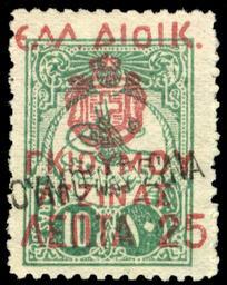 | Keywords: Giumultzine-1913-25L.png Greece/Thrace Greek occupation of Giumulzine today Komotini Greece Stamp issued immediately after the 2nd Balkan War 1913 Overprint ΕΛΛ Η ΙΚΗ ΔΙΟΙΚ ΗΣΙΣ ΓΚΙΟΥ ΟΥΛΤΖΙ ΑΣ the greek royal coat of arms and new value in greek currency on Ottoman stamp of 1909 issue The seal of the house of Osman tughra stands out below the overprint Ελλάδα - Θράκη Ελληνική διακυβέρνηση της Γκιουμουλτζίνας σήμερα Κομοτηνή Ελλάδα Γραμματόσημο ου εκδόθηκε αμέσως μετά το 2ο Βαλκανικό όλεμο 1913 κατά τη διάρκεια της ροσωρινής κατοχής της όλης α ό τον Ελληνικό Στρατό Είναι ορατή η σφραγίδα του σουλτάνου own collection 1913 1909 Basic stamp Unknown<br>Overprint Unknown PD-Ottoman PD-anon-70 original upload log en wikipedia Ggia CommonsHelper page en wikipedia Giumultzine-1913-25L png 2008-10-04 10 27 Sv1xv 566×710× 728424 bytes <nowiki> Summary Greece/Thrace Greek occupation of Giumulzine today Komotini Greece Stamp issued during the 2nd Balkan War 1913 Overprint ΕΛΛΗ ΙΚΗ ΔΙΟΙΚΗΣΙΣ ΓΚΙΟΥ ΟΥΛΤΖΙ ΑΣ the greek </nowiki> Komotini Stamps of Greece 1913 stamps Occupation stamps Tughra Stamps of Thrace Second Balkan War |