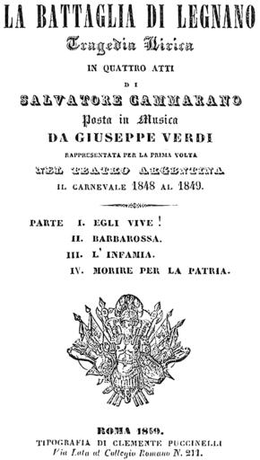 | Keywords: Giuseppe Verdi - La battaglia di Legnano - titlepage of the libretto, Rome 1849.png en Giuseppe Verdi - La battaglia di Legnano - titlepage of the libretto Rome 1849 1849 http //www conseve info/cgi-bin/w/ IsisScript /var/www/vhosts/www conseve info/httpdocs/isis/par/bm_c_03 xis Tag_1000 musica Tag_1004 1 Tag_1005 2 Tag_1013 1 Tag_1014 506 Tag_1015 Tag_1030 torrefranca Tag_1050 torrefranca Tag_2000 Tag_2020 0 Tag_2023 http //www conseve info/bm Tag_2024 /var/www/vhosts/www conseve info/httpdocs/isis Tag_2026 http //www conseve info/cgi-bin/w Tag_6000 Tag_1032 Giuseppe Verdi Salvatore Cammarano other versions PD-old-70-1923 La battaglia di Legnano Libretti of operas by Giuseppe Verdi 1849 opera libretti |