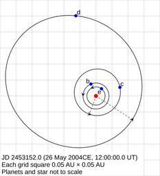 | Keywords: GJ581orbits.svg validSVG element in the SVG's source code gives further information <b>Assumptions </b> It is assumed that the system is coplanar This cannot be constrained by the radial velocity observations used to detect the planets in this system but our solar system's planets are nearly coplanar and both the systems of PSR B1257+12 planets B and C and Epsilon Eridani planet b and the circumstellar disk are coplanar see http //adsabs harvard edu/abs/2003ApJ 591L 147K Konacki and Wolszczan 2003 The Astrophysical Journal 591 L147 “L150 Masses and Orbital Inclinations of Planets in the PSR B1257+12 System and http //adsabs harvard edu/abs/2006AJ 132 2206B Beust et al 2006 The Astrophysical Journal 132 2206 “2218 The Extrasolar Planet É› Eridani b Orbit and Mass respectively so this assumption is at least reasonable The direction of rotation around the star is assumed to be the same for each planet Again this cannot be constrained by the current radial velocity observations but is a reasonable assumption since this is true for the major planets in our own solar system and is predicted by current theories of planet formation Under these first two assumptions the orientation of the orbits relative to each other is correct as depicted in this diagram however their actual orientation in 3D space with respect to external reference points e g the Sun the galactic centre is unknown hence such directions are not indicated on the diagram A further assumption is that the true masses of the planets are small compared to that of the star If the masses were comparable to that of the star the actual semimajor axis corresponding to the measured orbital period would be greater This assumption is supported both by probability the chance that we are observing a system which has sufficiently low inclination for this to be relevant is very low and by dynamical stability arguments which indicate that the planets cannot have true masses much more than 1 6 times their minimum masses Mayor et al 2009 This effect can therefore safely be neglected <b>Interpreting the diagram</b> The planetary orbits are drawn in orthographic projection as viewed from directly above the plane of the system so that the orbital direction is anticlockwise The dashed lines are drawn between the star and the periastron point of each planet in order to depict the relative orientation of the orbits with respect to each other The position of each planet in its orbit is calculated using the time of periastron in the table in the Mayor et al 2009 paper and are drawn at a time chosen to be close to the start of the Udry et al 2007 radial velocity observations which are available http //cdsarc u-strasbg fr/ftp/cats/J/A+A/469/L43/gl581 dat here This time is chosen to minimise the effects of both uncertainties in the orbital parameters and potential orbital evolution of the system While the orbits are drawn to the correct scale the star and the planets themselves are not shown to scale as they would be too small to see on the scale of this diagram In addition the true radii of the planets themselves are currently unknown as no direct observation of the planets has yet been made own Icalanise 2008-10-05 <gallery> File GJ581orbits Vogt2010 svg Planetary orbits according to Vogt et al 2010 incorporating orbit of unconfirmed super-Earth GJ 581 g </gallery> Gliese 581 Gliese 581 c Exoplanet diagrams |