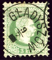 | Keywords: GLADYSZOW Issue1874.jpg en Austrian KK 3 kreuzer stamp issue 1874 cancelled at GLADYSZOW Galicia Poland - District Gorlice - Year blacked Klein 1298 2012-11-11 12 26 09 own Jacquesverlaeken Scanned object > 100 years old - Postoffice opened 1 November 1877 cc-zero Uploaded with UploadWizard Gładyszów Green stamps Postmarks of Poland 1850-1919 1874 stamps of Austria |