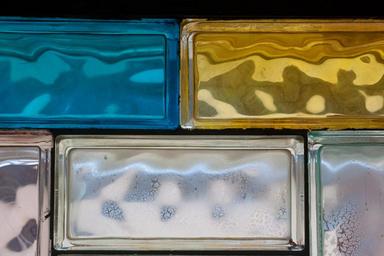 Keywords: glass blocks rectangular components blue yellow pink bad old seventies reflection incidence of light fogging calcified architecture building by looking