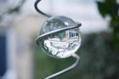Keywords: glass bowl effect spiral reflection mirror house outside metal focus garden window