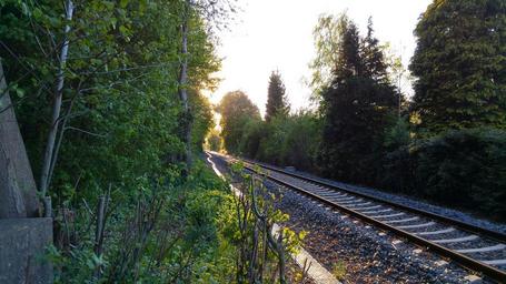 Keywords: gleise trees stones scree railway nature straight sunset sunlight landscape sky silent